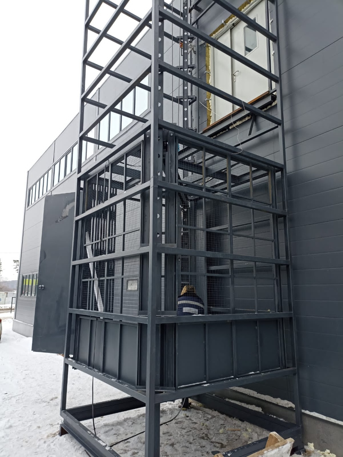 Подъемник в металлокаркасной шахте, ГП 2000 кг с выгрузкой на 90 градусов