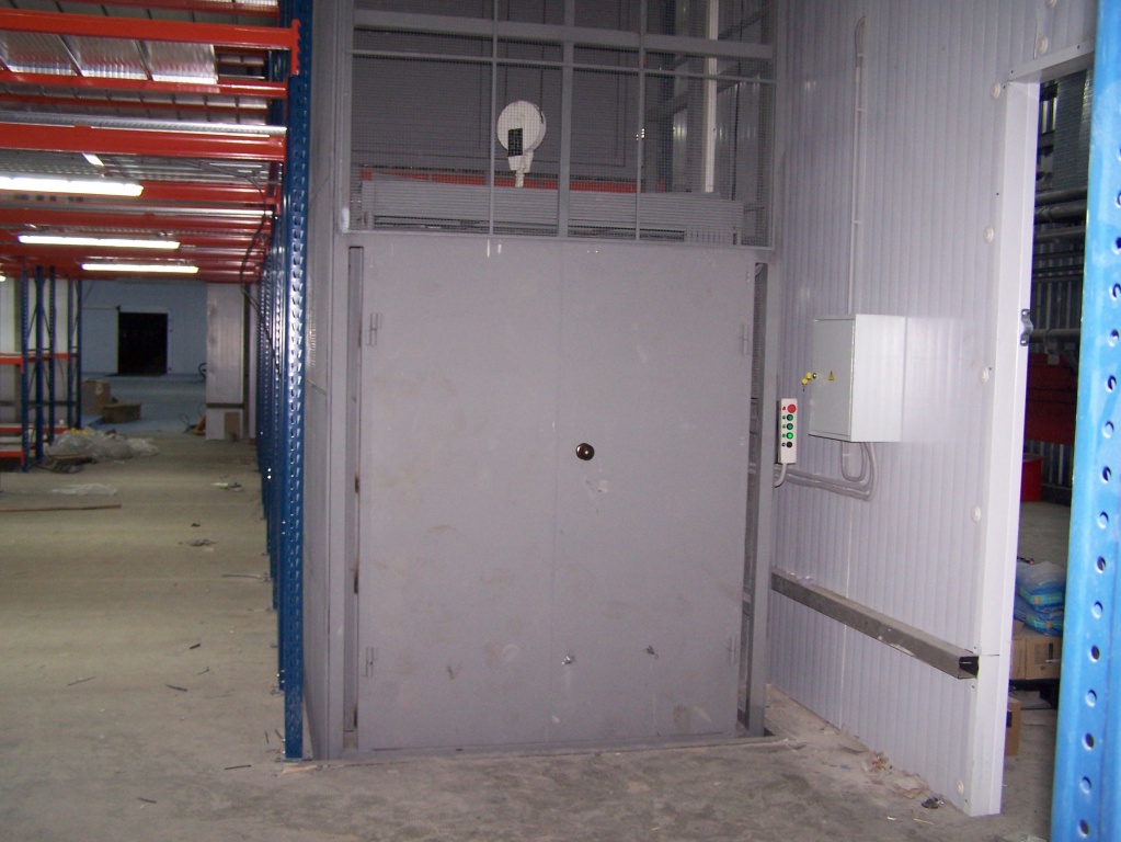 Подъемник в металлокаркасной шахте, ГП 2000 кг с выгрузкой на 90 градусов